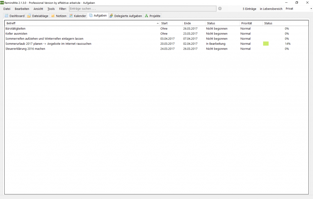 Außerdem sieht man (wie im Dashboard) einen Fortschrittsbalken, zu wieviel Prozent eine Aufgabe erledigt ist. Diese kann entweder manuell gesetzt werden, oder berechnet sich aus den Anteil der erledigten Teilschritte der Aufgabe, welche unter dem Reiter Checkliste eingetragen werden.